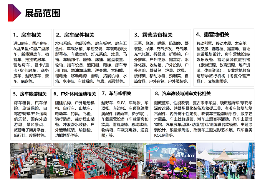 全产业链盛会:深度整合房车、改装、露营、配件及车文化五大板块。