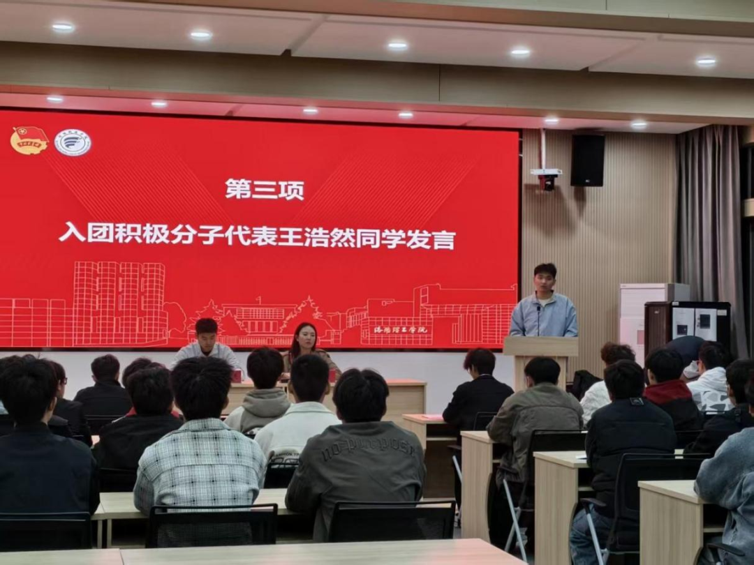 随后入团积极分子代表王浩然同学上台发言。他表达了对共青团组织的敬意与向往,并承诺将以实际行动严格要求自己,积极向团组织靠拢,努力成为一名合格的共青团员。