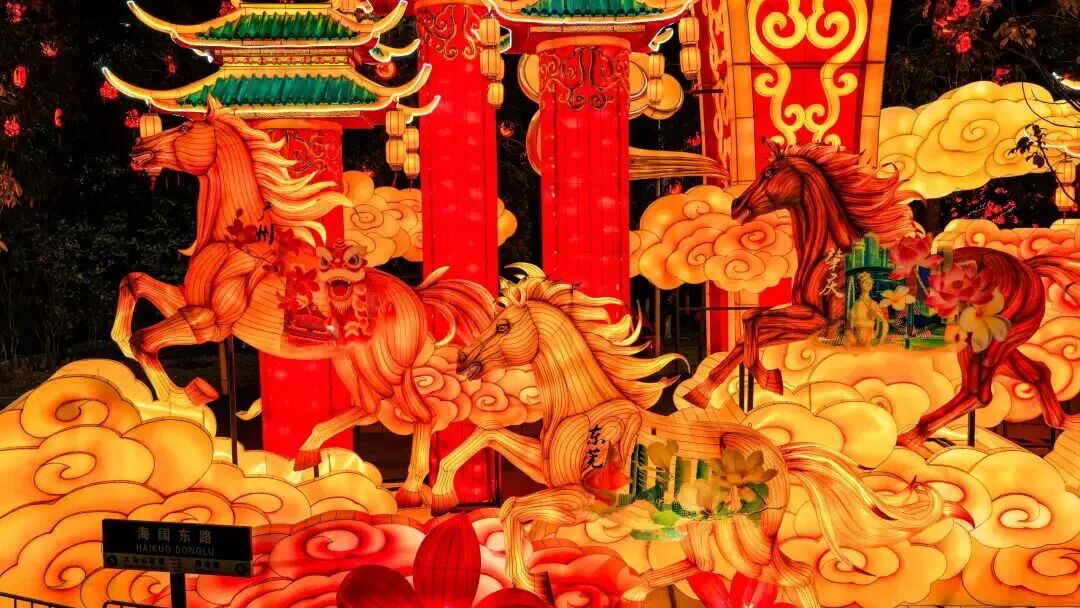 踏入大门,“星河驰骋·骏马腾云” 灯组震撼扑面。11匹神骏姿态昂扬、腾跃云间,它们象征粤港澳大湾区“9+2”城市血脉相连,这是粤港澳大湾区送给祖国最奔腾的新春祝福。
