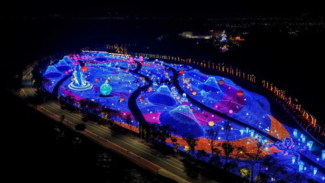 谁说花灯只能传统风?在 “逍遥天地·数智未来” 展区,4.5万㎡的星光草坪幻化为流动银河,多个星球和宇宙生物错落其中。