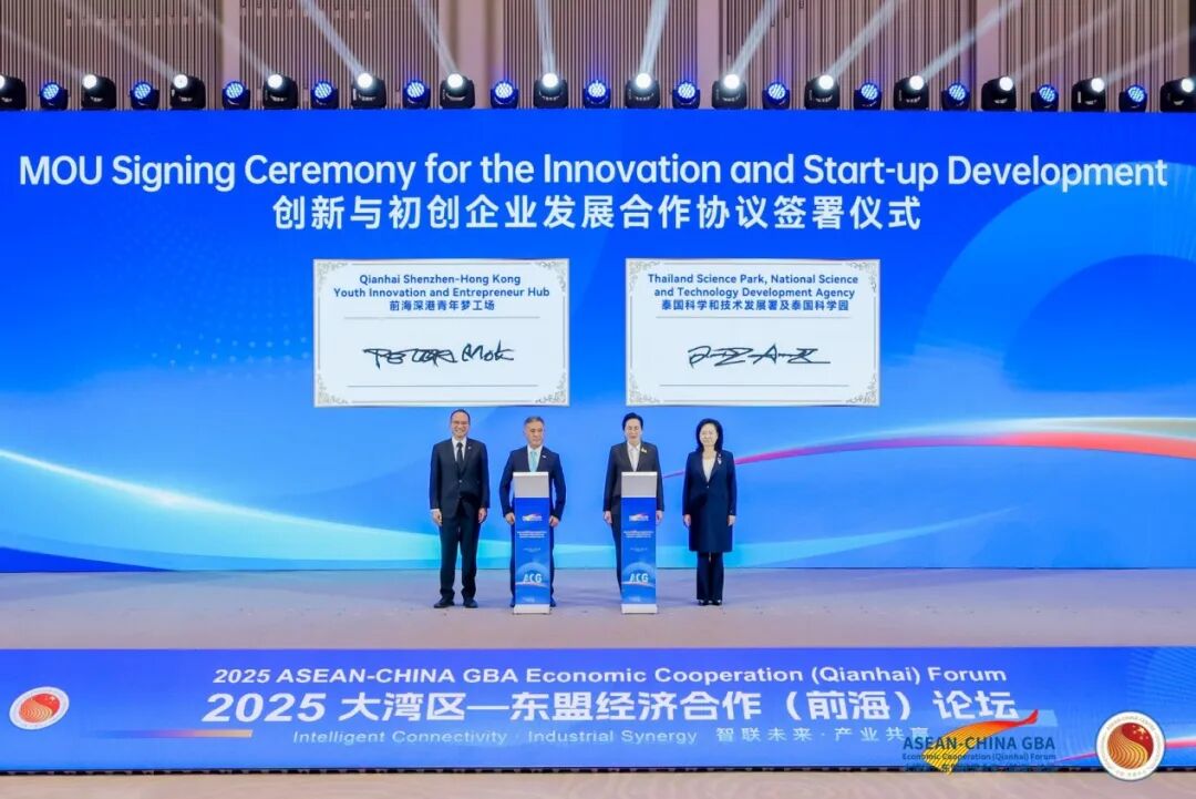 11月27—28日,2025大湾区—东盟经济合作(前海)论坛在深圳前海国际会议中心举办。论坛以“智联未来・产业共赢”为主题,聚焦深化区域合作,推动粤港澳大湾区与东盟国家在数字经济、人工智能、绿色能源等新兴领域的务实合作。值得关注的是,前海深港青年梦工场有幸受邀参与此次备受瞩目的盛会,其与泰国科学和技术发展署(NSTDA) 、泰国科学园的签约,不仅是梦工场的亮眼成果,更成为本次论坛务实合作的高光。