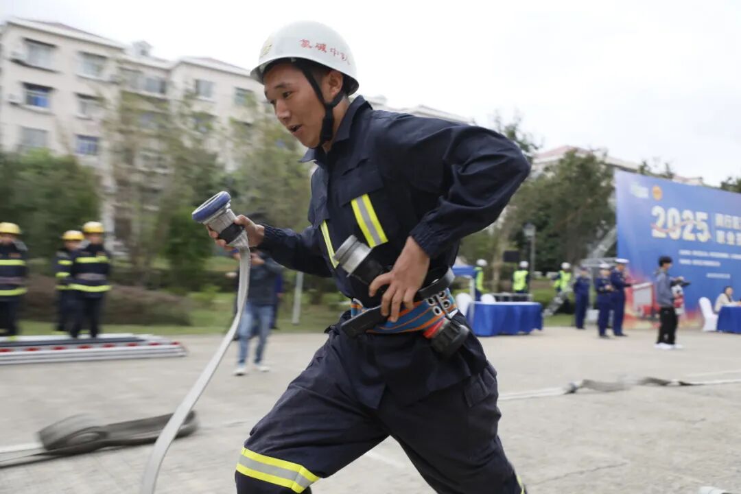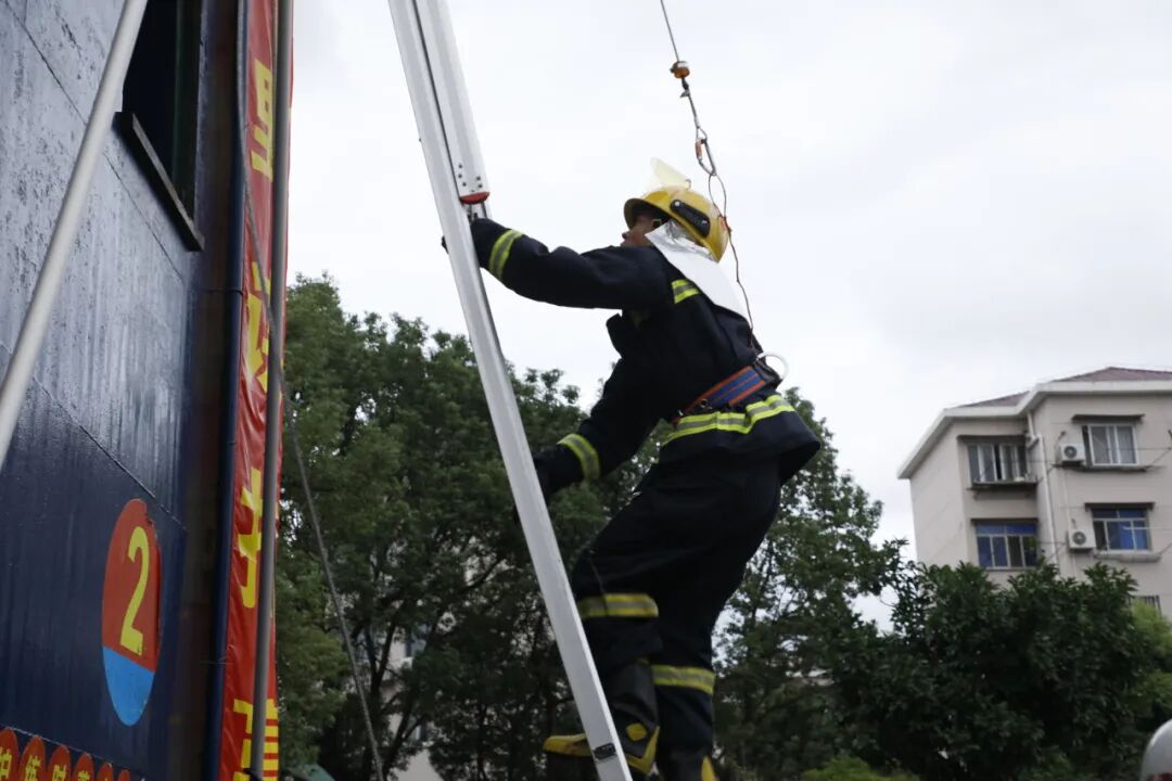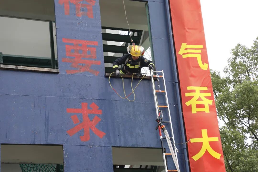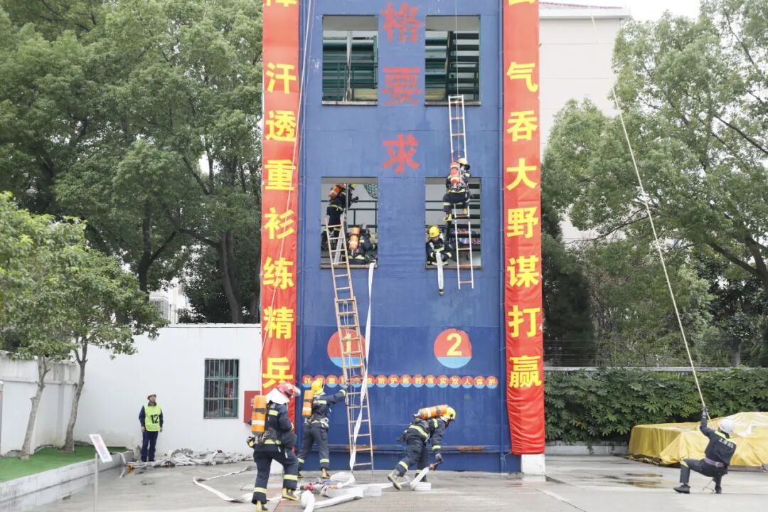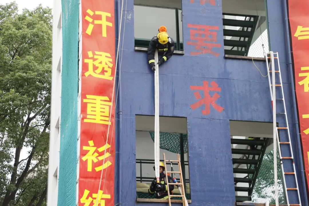 队伍通过内部疏散楼梯快速登高,完成楼层水带铺设、阵地设置与协同灭火等一系列战术动作,模拟高层建筑火灾扑救的真实场景。
