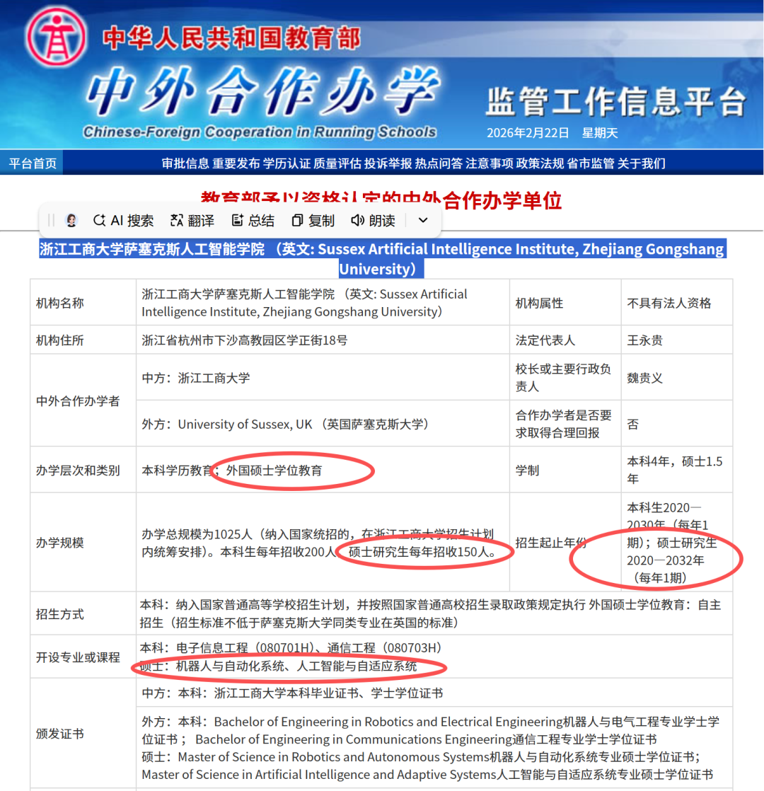 2020年教育部认证办学,硕士培养质控严格。浙江工商大学信息类学科为浙江省一流,"AI+商业"成果支撑应用研究;萨塞克斯大学是全球前1%名校、被誉为全球认知科学和人工智能领域范式转换研究的发源地,诞生过6位诺奖得主,双校硬核背书。