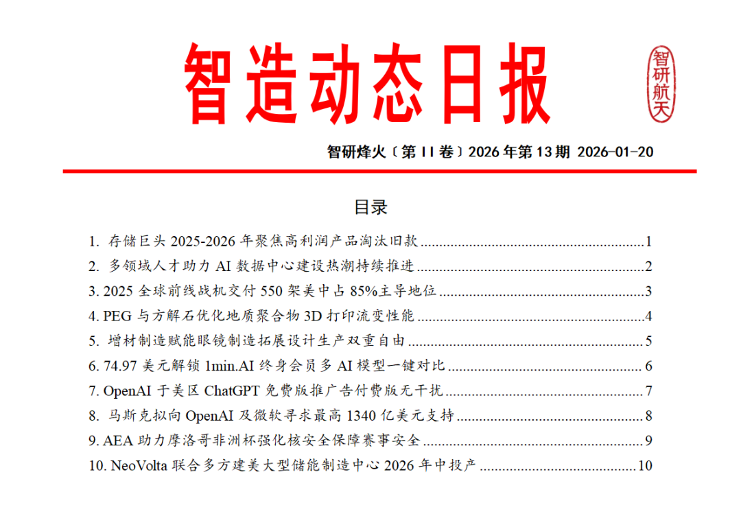 聚焦全球智能制造领域的权威情报产品,每日精选航空技术与应用人工智能、工业机器人、增材制造、芯片工艺等核心技术突破与产业动态,以结构化、可编辑的文档形式呈现。内容涵盖技术解析、企业战略及政策影响,依托资深专家团队及强大的开源情报处理能力,助力企业快速捕捉技术趋势与市场机遇,把握智造脉搏,引领产业升级。