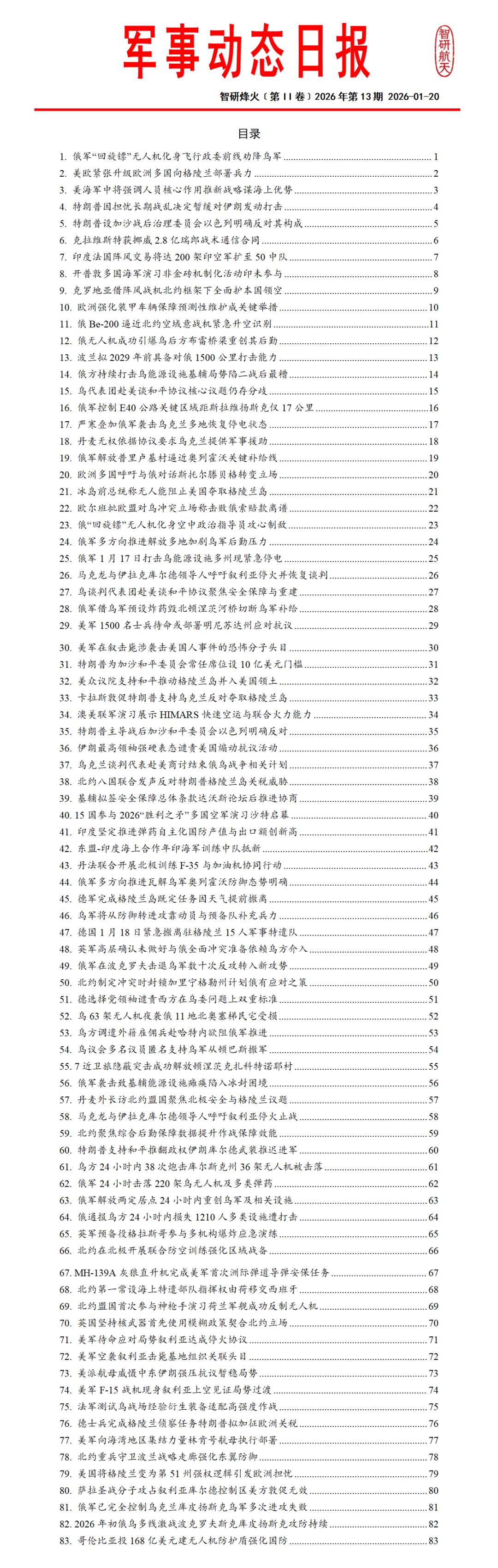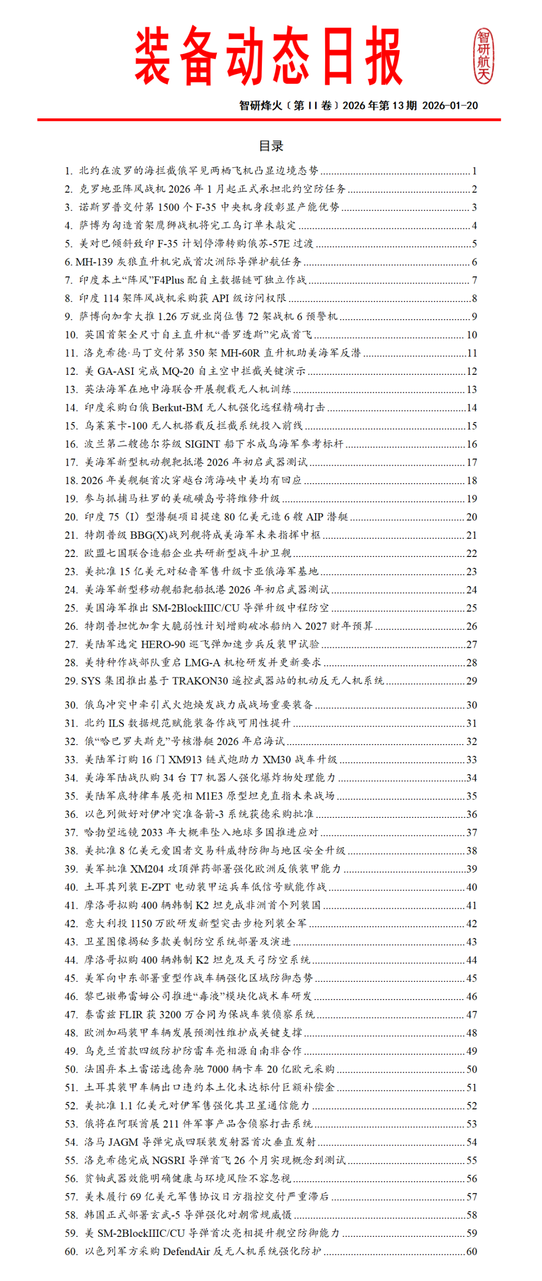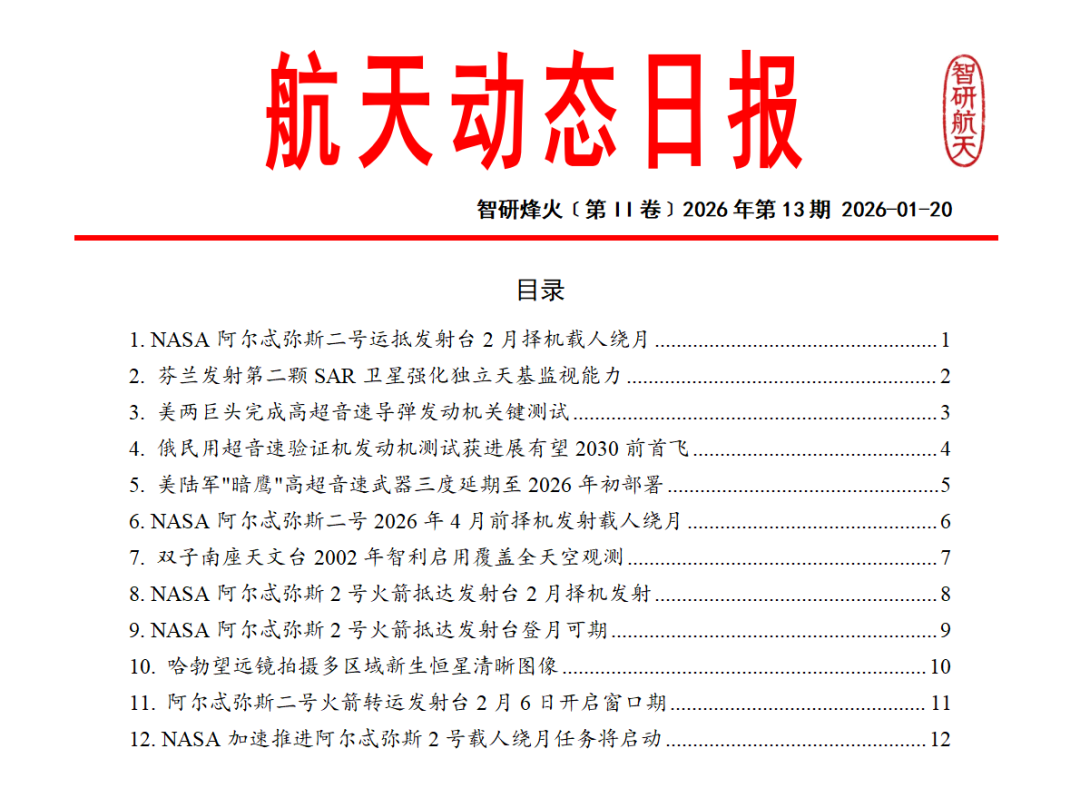 《全球防务动态》系列专刊国内独家每日发布涵盖航天领域、武器装备、军事热点、人工智能、先进制造等领域的全球动态信息。提供航天动态专报装备动态专报军事动态专报智造动态专报以及航天防务新闻日报等特色产品模块工作日每日推送,形成结构化、可编辑的文档,供订阅用户在小程序智研烽火信息商城下载。每日及时的动态信息能够有支持各单位进行报送、军情研究与安全形势分析的需求。
