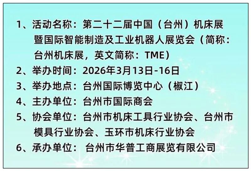 机床行业的年度盛会——第二十二届台州机床展将于2026年3月13-16日在台州国际博览中心(椒江)举行。