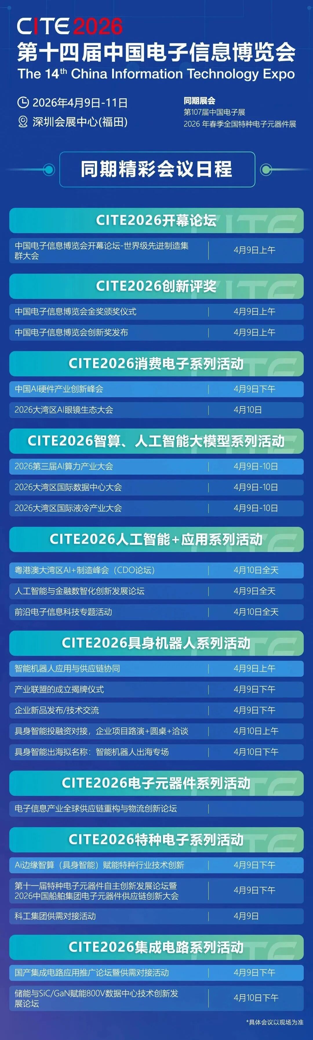 随着深圳“十五五”规划重磅出炉,加快新一代信息技术、新能源、高端装备、新材料、低空经济、航空航天等战略性新兴产业集群发展,扩大智能终端、网络与通信、智能网联汽车、集成电路、全屋智能等产业优势,全球电子信息产业的目光再次聚焦深圳。备受瞩目的第十四届中国电子信息博览会(CITE2026)将于2026年4月9日至11日在深圳会展中心(福田)隆重举行。本届博览会同期将举办第107届中国电子展、2026春季全国特种电子元器件展,三展联动,共同打造一场覆盖电子信息全产业链的科技盛宴。