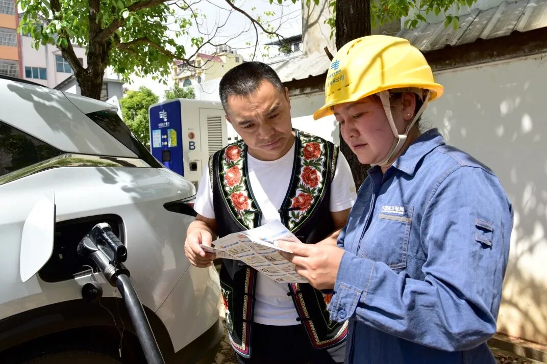 昆明禄劝供电局工作人员向新能源车主发放宣传手册。龙振江/摄