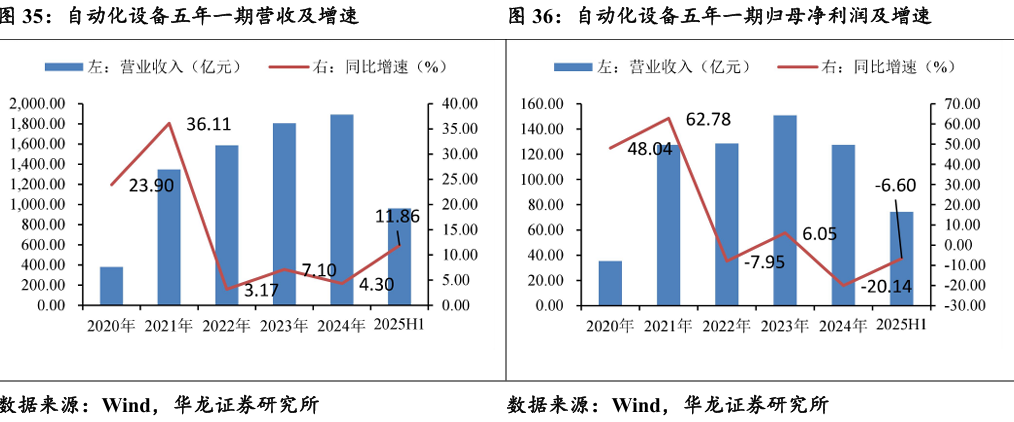 自动化设备2025年上半年实现营业收入960.49亿元,同比+11.86%; 实现归母净利润74.32亿元,同比-6.6%,是五大子行业中唯一利润出现下 滑的板块。