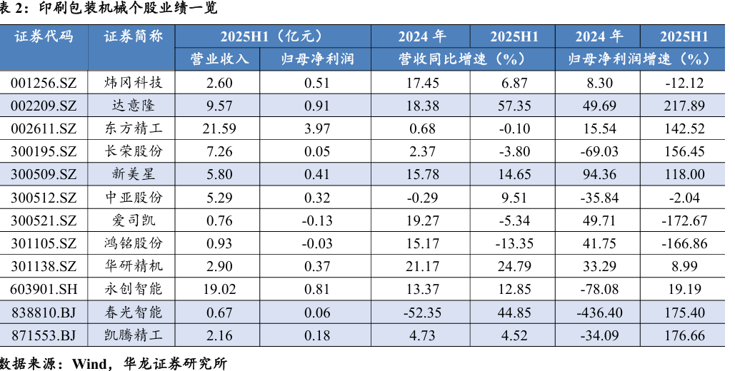 2025年上半年,印刷包装设备营收利润双增,且利润增速较高。我们进 一步分析个股,发现主要系达意隆(002209.SZ)、新美星(300509.SZ)、 春光智能(838810.BJ)、凯腾精工(871553.BJ)等贡献主要增量。