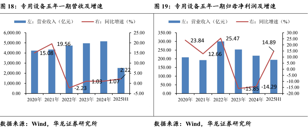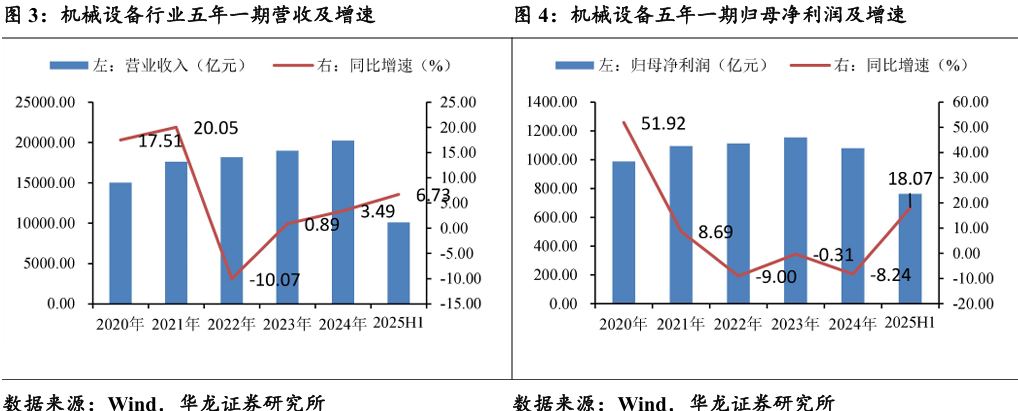 用设备:内部分化,印刷包装&其他专用表现较好。专用设备 2025 年上半年实现营业收入2518.21亿元,同比+2.22%;实现归 母净利润193.89亿元,同比+14.89%。子板块表现分化,印刷包 装机械&其他专用设备表现较好,楼宇设备受房地产影响表现不 佳。