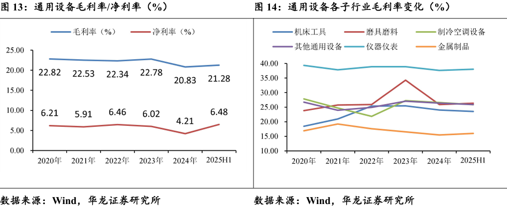 受益于金属制品盈利能力提升,行业整体毛利率同比正增长。2025年 上半年,通用设备板块整体实现毛利率21.28%,同比+0.69pct;净利率6.48%, 同比+0.94pct,盈利能力有所增强。子板块中,仅金属制品毛利率同比 +1.45pct,录得16.01%;仪器仪表毛利率为38.01%,同比持平;其余板块 毛利率均出现下滑,其中制冷空调设备下滑幅度较大,同比-1.4pct。