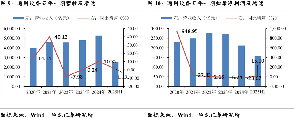 通用设备:周期底部,业绩有所修复。通用设备板块2025年上 半年共实现营业收入2551.83亿元,同比+1.17%;实现归母净利 润157.96 亿元,同比+15%。通用设备具有较强周期性,与宏观 经济景气度密切相关。目前板块整体仍处于周期底部,行业内部 存在结构性机会。