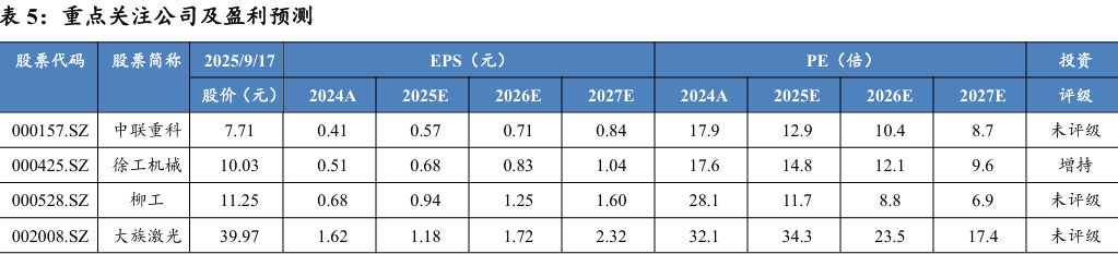 我们认为:内需受益于新一轮集中换新周期到来,以及雅下水电站、 新藏铁路等大型项目开工,以工代赈有望助力行业内需向好。海外结构性 景气,“一带一路”沿线国家的基础设施建设需求持续增长,带动出口增 长。龙头企业凭借“技术升级+全球化布局”双引擎,海外市占率持续提 升,中长期增长动能强劲。