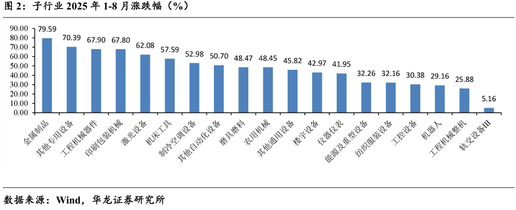 子行业全部取得正收益,其中金属制品、其他专用设备、工程机械器件、印刷包装设备、激光设备收益靠前,分别+79.59%、+70.39%、+67.9%、 +67.8%、+62.08%;轨交设备表现相对靠后,仅上涨5.16%,其次为工程机械整机和机器人板块,分别+25.88%、+29.16%。