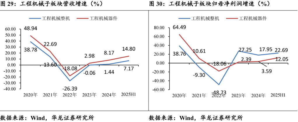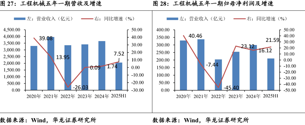 工程机械:国内外共同驱动,有望迎来长周期共振。工程机械2025 年上半年实现营业收入2055.65亿元,同比+7.52%;实现归母净 利润209.99 亿元,同比+21.59%。受益于主要企业经营质量提升, 以及毛利较高的出口占比提高,行业利润率提升高于收入增速。
