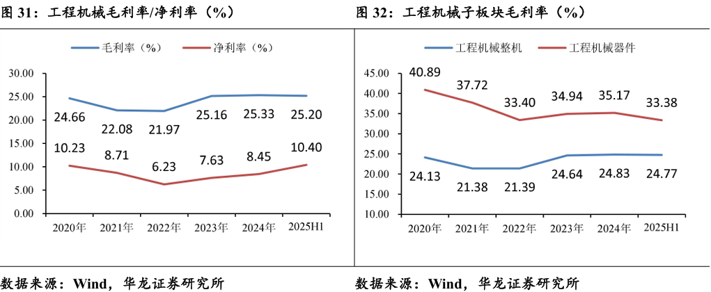 2025年上半年,工程机械行业整体毛利率为25.2%,同比-0.4pct;实 现净利率10.4%,同比+1.02pct。细分来看,器件毛利率高于整机,整机毛 利率24.77%,同比-0.31pct;器件毛利率33.38%,同比-1.61pct。
