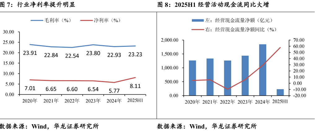 盈利能力有所增强,经营质量改善明显。2025年上半年行业整体毛利 率为23.23%,同比+0.04pct;净利率8.11%,同比+0.84pct。行业盈利能力 有所改善,净利率提升明显。2025年上半年,行业经营活动现金流量净额 230.26亿元,同比大增57.91%,经营质量显著改善。