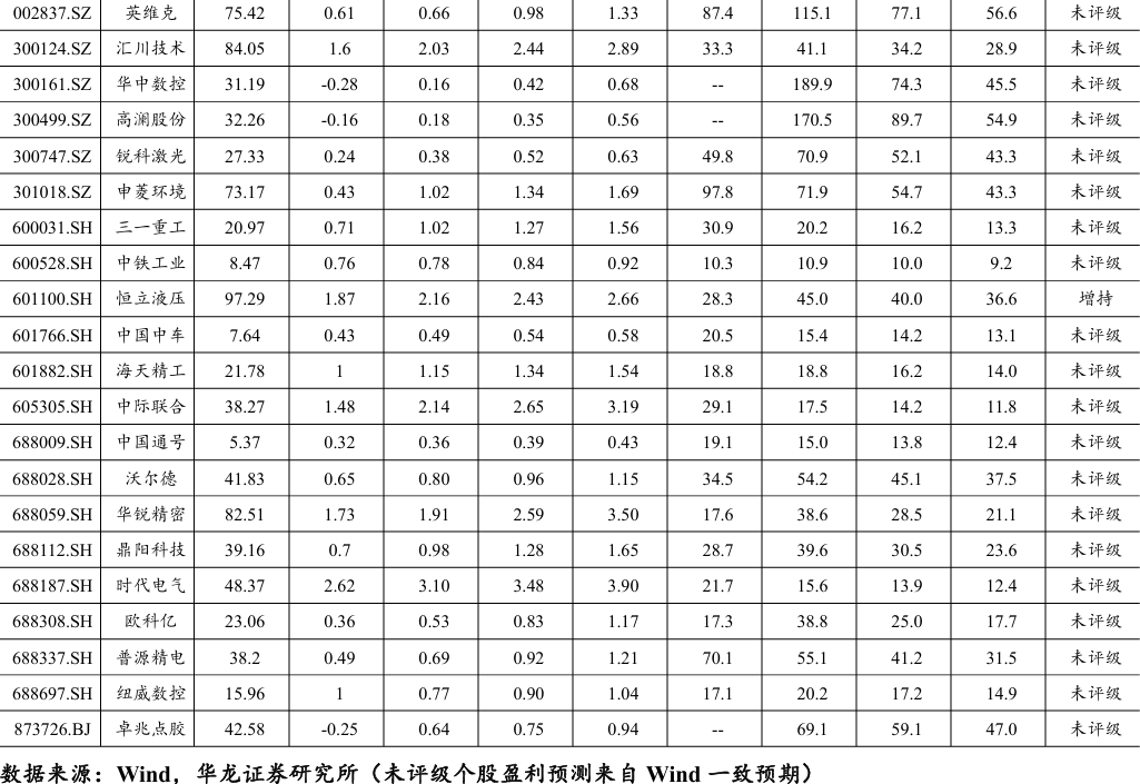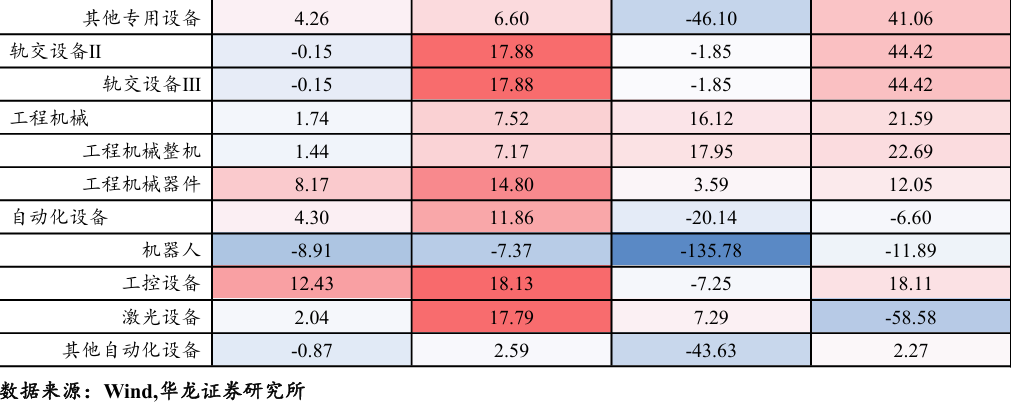 投资建议:上半年行业整体营收、利润均实现正增长,且利润增速远高于营收增速,行业基本面有所改善,维持行业“推荐”评级。通用设备:关注①内需筑底,海外表现较好,近年来伴随大国竞争的加剧,高端机床工具自主可控迫切性提升,可关注高端五轴机床、数控系统及核心功能部件的投资机会。②毛利率较高,受益于国产替代推进业绩改善明显的仪器仪表板块。个股:海天精工(601882.SH)、纽威数控(688697.SH)、华中数控(300161.SZ)、 欧科亿(688308.SH)、华锐精密(688059.SH)、沃尔德(688028.SH)、 普源精电(688337.SH)、鼎阳科技 (688112.SH)等。专用设备:关 注印刷包装机械、液冷以及消费电子设备。个股:申菱环境 (301018.SZ)、英维克(002837.SZ)、高澜股份(300499.SZ)、 卓兆点胶(873726.BJ)等。轨交设备:轨交设备经过多年发展, 目前形成了较为稳定的竞争格局,龙头占据较大市场份额,建议关注龙头企业。个股关注:中国中车(601766.SH)、中铁工业 (600528.SH)、 中国通号(688009.SH)、时代电气(688187.SH)等。 工程机械:国内外共同驱动,有望迎来长周期共振,关注主机龙头及核心零部件。个股:徐工机械(000425.SZ)、三一重工 (600031.SH)、中联重科(000157.SZ)、柳工(000528.SZ)、中 际联合(605305.SH)、恒立液压(601100.SH)等。自动化设备: 行业内部分化严重,关注工控及激光设备板块。个股:汇川技术 (300124.SZ)、锐科激光(300747.SZ)、大族激光(002008.SZ)等。