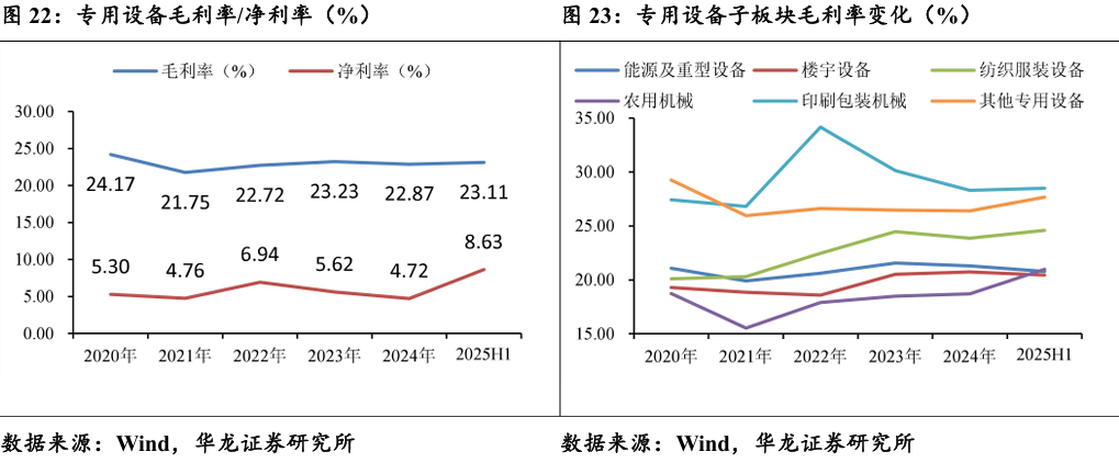 专用设备净利率提升明显,细分板块盈利能力有所分化。2025年上半 年专用设备毛利率为23.11%,同比-0.28pct;净利率为8.63%,同比+1.25pct, 提升明显。子板块中,农用机械毛利率20.98%,同比+1.59pct;其他专用 设备毛利率27.66%,同比+1.01pct;其余板块毛利率均出现同比下滑,其 中印刷包装设备为28.49%,同比-1.67pct,下降较多。