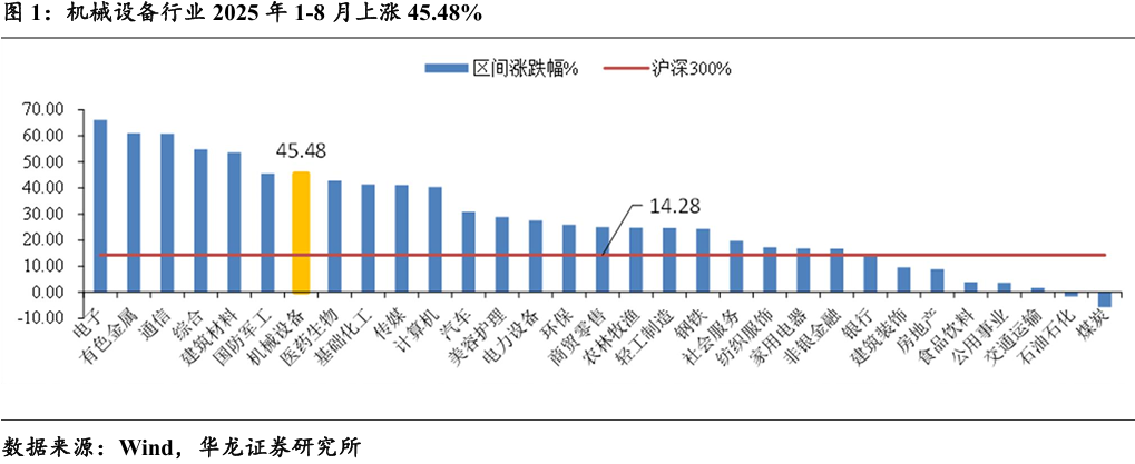 2025年年初至今(2025年8月31日),机械设备行业上涨45.48%, 同期沪深300指数上涨14.28%,相对收益31.2%,在一级31个行业中排名第7位。