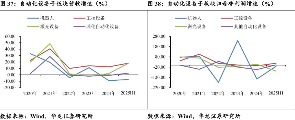 分子板块,收入端:工控设备&激光设备表现较好,机器人板块继续 筑底。2025年上半年子板块收入增速由高到低依次为工控设备(+18.13%)、 激光设备(+17.79%)、其他自动化设备(+2.59%)、机器人(-7.37%)。