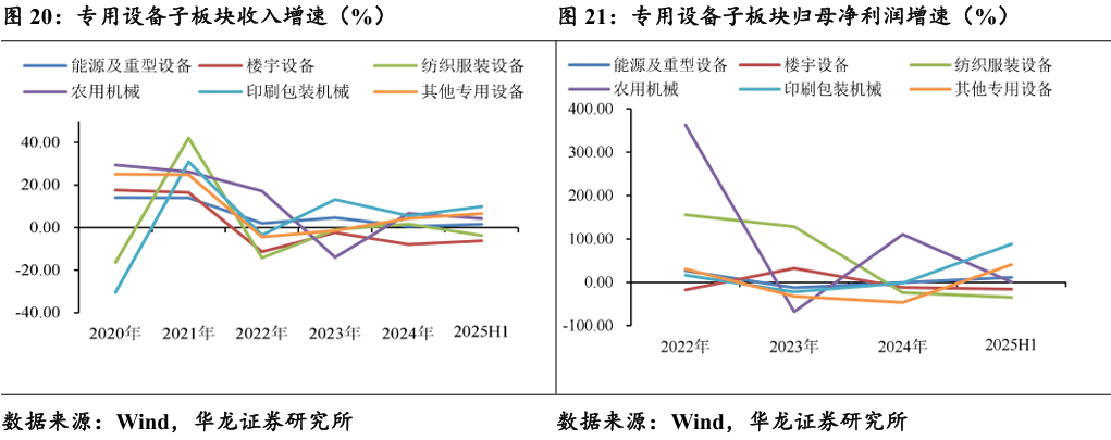 分子板块来看,收入端:印刷包装机械&其他专用设备收入增长较快, 楼宇设备受房地产影响下滑较多。2025年上半年专用设备子板块营业收入 增速由高到低分别为印刷包装机械(+9.84%)、其他专用设备(+6.6%)、 农用机械(+4.22%)、能源及重型设备(+1.53%)、纺织服装设备(-3.72%)、 楼宇设备(-6.23%)。
