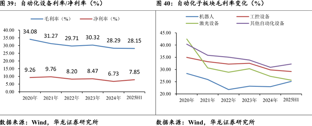 2025年上半年,自动化设备毛利率28.15%,同比-1.58pct;净利率7.85%, 同比-1.32pct,盈利能力有所恶化。子板块中,机器人板块毛利率25.12%, 同比+2.01pct,机器人板块持续筑底,但企业盈利能力有所恢复;其余板 块毛利率均同比下滑,激光设备毛利率同比-4.01pct,工控设备毛利率同比-2.44pct。