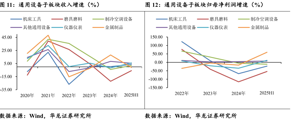 分子板块看,收入端:增速主要由仪器仪表、其他通用设备贡献,金 属制品与磨具磨料营收同比下滑。2025年上半年通用设备子板块收入增速 由高到低分别为仪器仪表(+5.98%)、其他通用设备(+5.44%)、机床工具 (+3.7%)、制冷空调设备(+2.05%)、金属制品(-0.85%)、磨具磨料(-5.87%)。 分子板块看,利润端:归母净利润增速主要由金属制品、仪器仪表贡献,磨具磨料盈利大幅恶化。2025年上半年通用设备各子板块归母净利润 同比增速由高到低分别为金属制品(+59.67%)、仪器仪表(+11.93%)、其 他通用设备(+7.83%)、制冷空调设备(-11.1%)、机床工具(-22.21%)、 磨具磨料(-54.29%)