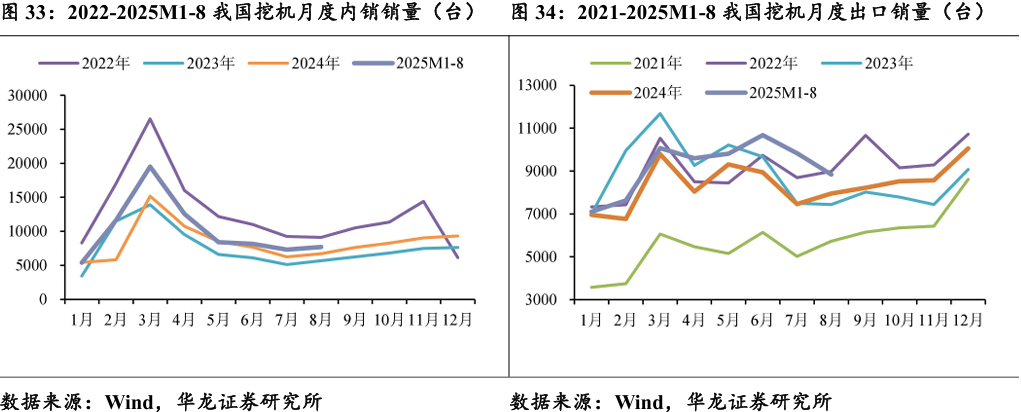 挖机销量数据回暖。2025年8月销售各类挖掘机16523台,同比增长 12.81%。其中,国内销量7685台,同比增长14.8%;出口量8838台,同 比增长11.13%。2025年1-8月,共销售挖掘机154181台,同比增长17.2%; 其中国内销量80628台,同比增长21.55%;出口73553台,同比增长12.79%。