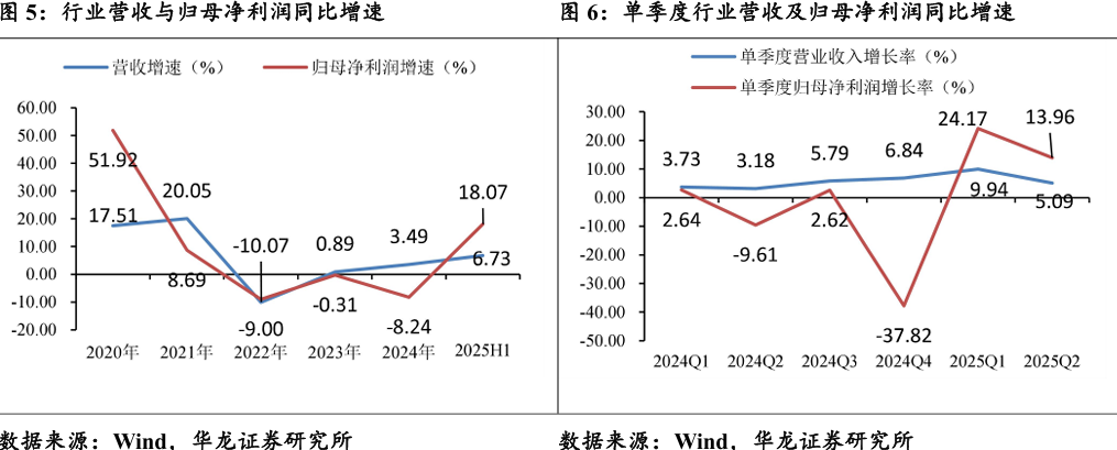 单二季度:行业整体营业收入增速为5.09%,同比+1.91pct,营业收入 连续六个季度保持正增长;归母净利润增速13.96%,同比+23.57pct,环比-10.22pct。二季度利润增速边际下降,但仍保持双位数增长,整体看2025H1 行业基本面改善明显。