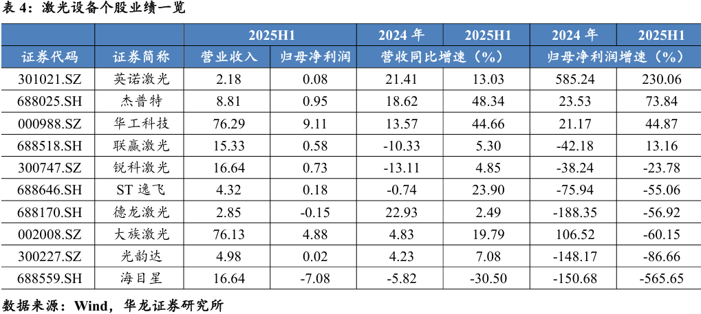 激光设备景气度与下游高度相关,2025年上半年在光伏TOPCon电池、 新能源汽车、储能、3C等领域需求拉动下,行业营业收入增长较快。但归 母净利润下滑幅度较大,主要是受海目星(688559.SH)、光韵达(300227.SZ)、 大族激光(002008.SZ)、德龙激光(688170.SH)等公司的影响。