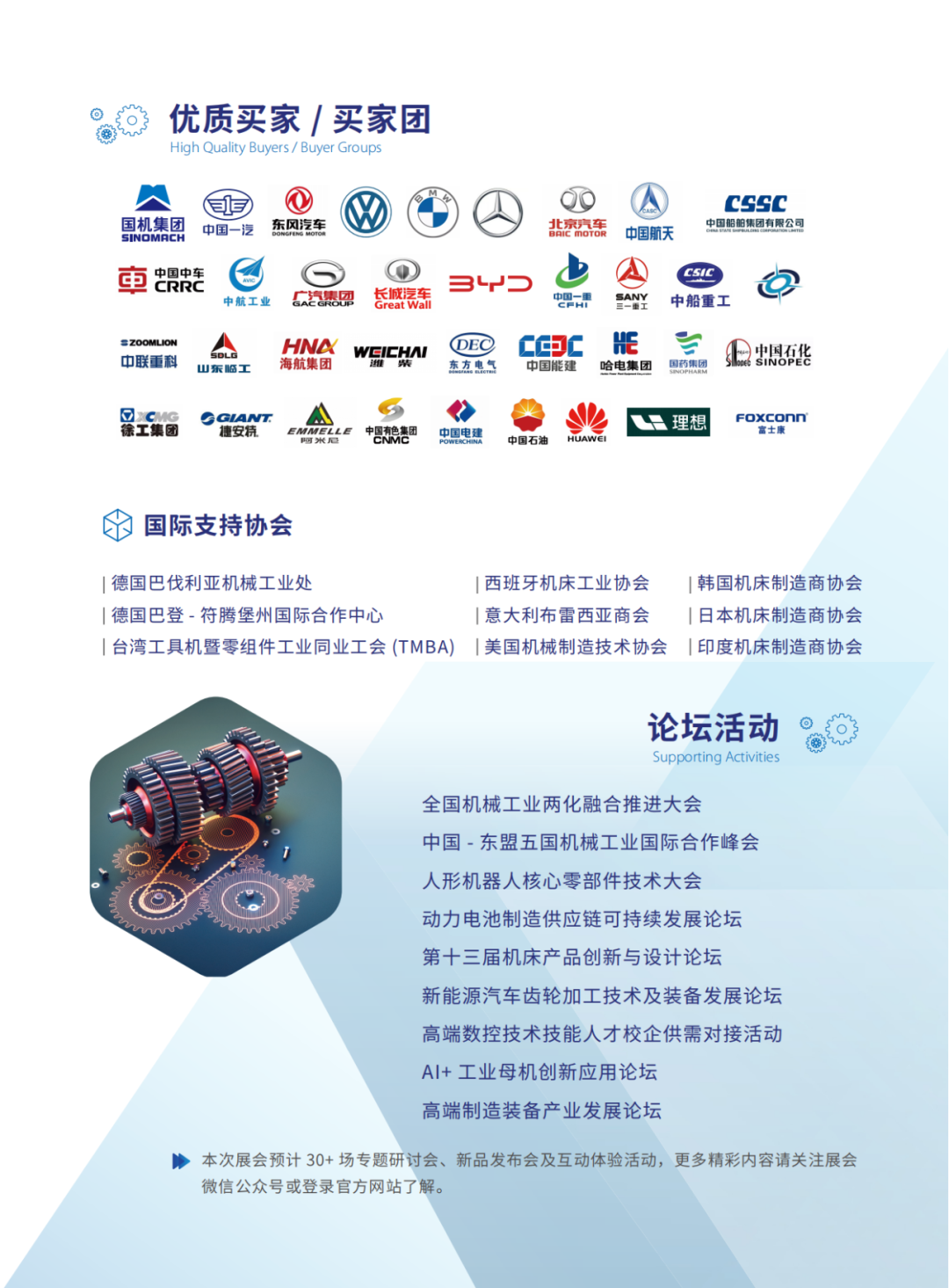 相关制造技术及设备:轴承与齿轮加工技术及设备、模具加工技术及设备、增材制造(3D打印)、AI与智能工厂、新能源汽车制造技术。