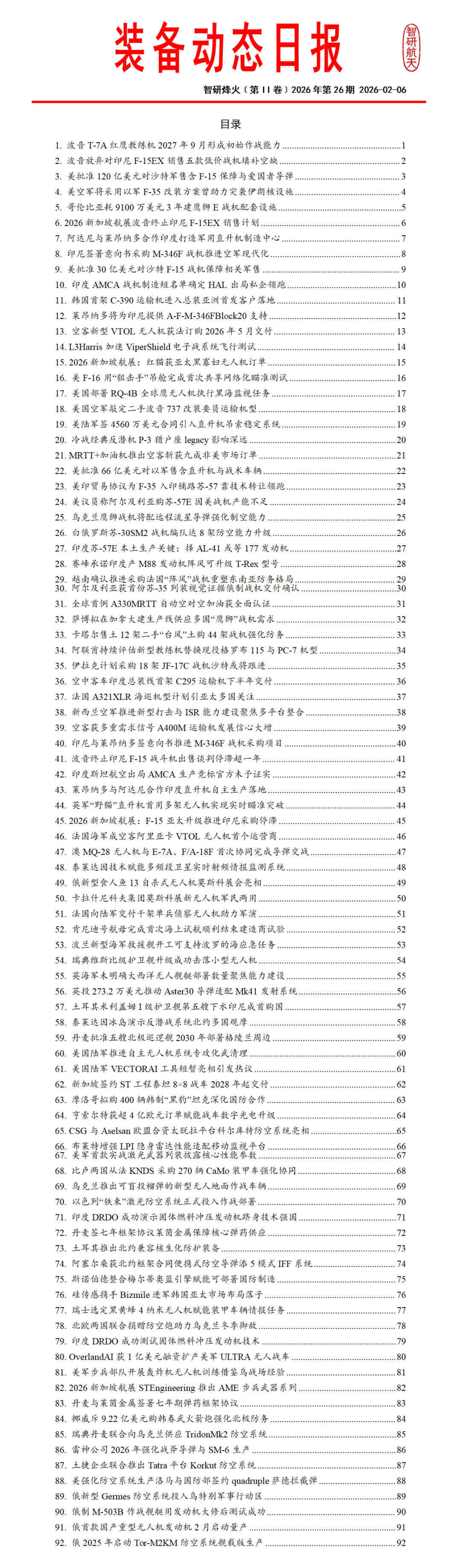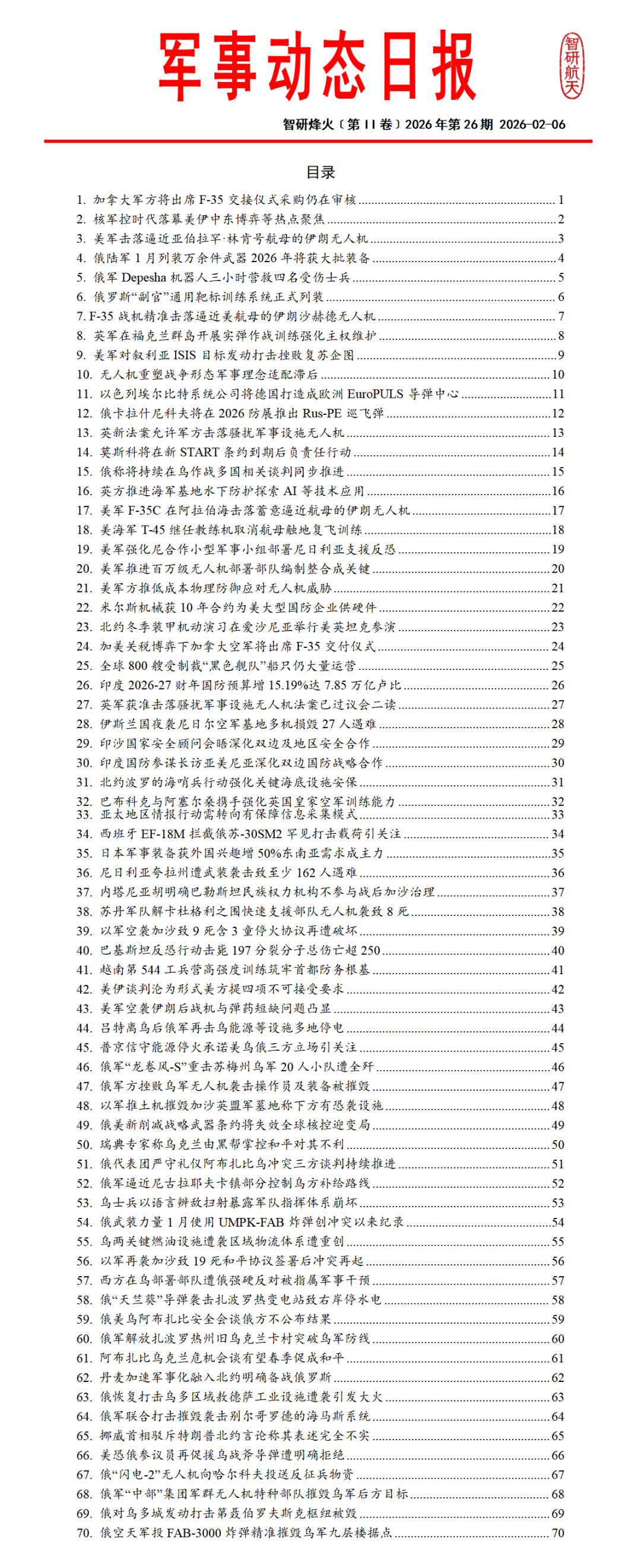 《全球防务动态》系列专刊国内独家每日发布涵盖航天领域、武器装备、军事热点、人工智能、先进制造等领域的全球动态信息。提供航天动态专报装备动态专报军事动态专报智造动态专报以及航天防务新闻日报等特色产品模块工作日每日推送,形成结构化、可编辑的文档,供订阅用户在小程序智研烽火信息商城下载。每日及时的动态信息能够有支持各单位进行报送、军情研究与安全形势分析的需求。