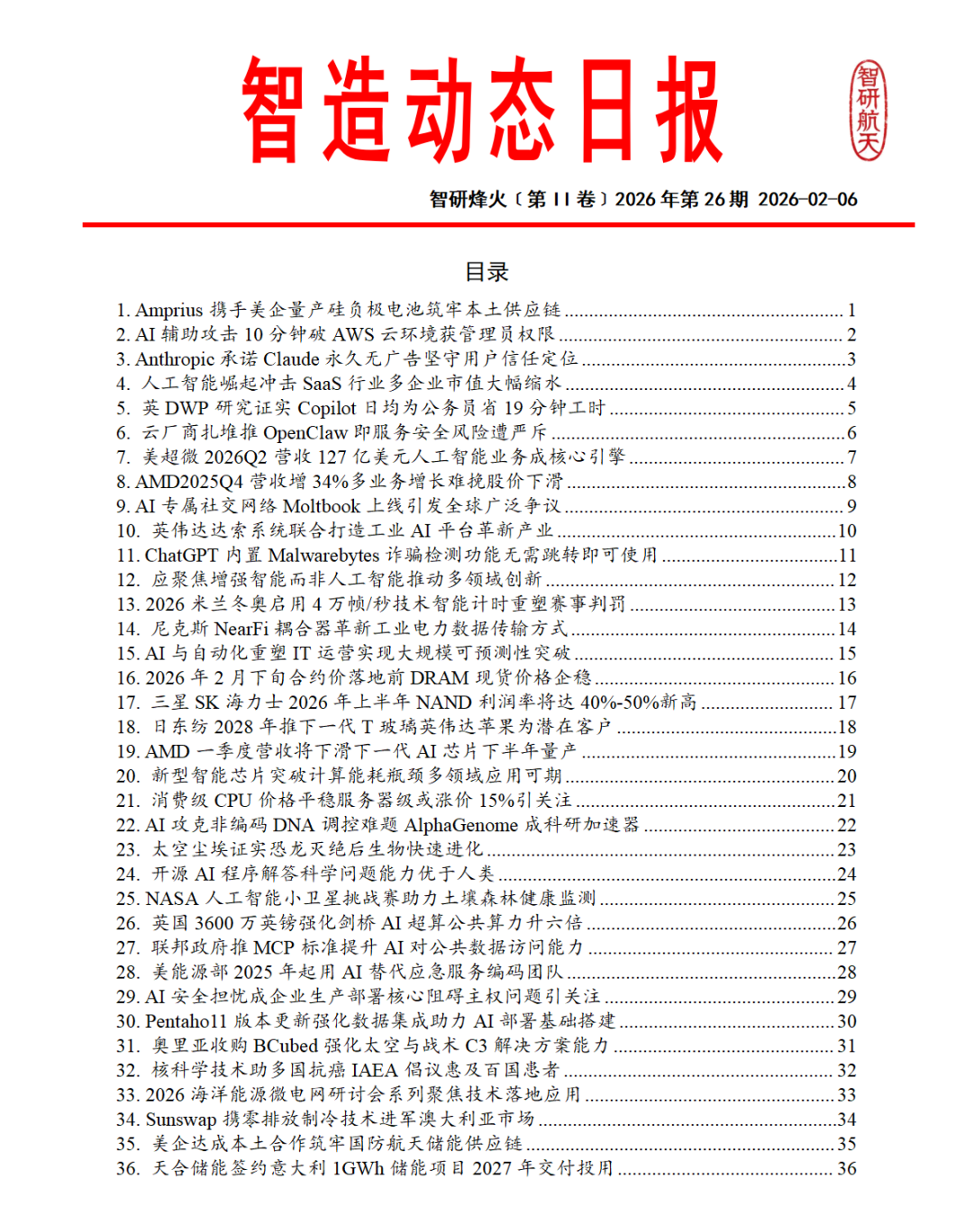 聚焦全球智能制造领域的权威情报产品,每日精选航空技术与应用人工智能、工业机器人、增材制造、芯片工艺等核心技术突破与产业动态,以结构化、可编辑的文档形式呈现。内容涵盖技术解析、企业战略及政策影响,依托资深专家团队及强大的开源情报处理能力,助力企业快速捕捉技术趋势与市场机遇,把握智造脉搏,引领产业升级。
