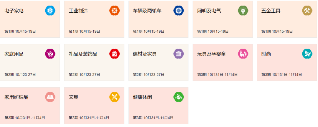 第一期时间:10月15日-19日(电子家电、工业制造、车辆及两轮车、照明及电气、五金工具)