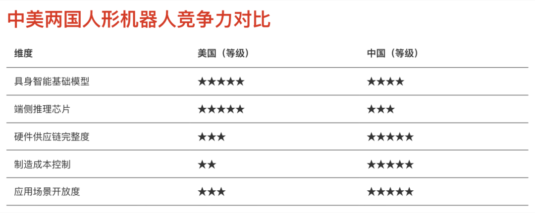 也正是在这样的评判标准下,我们得以重新看待“人形机器人”这条赛道的核心逻辑。它,或许不应被简单视为消费电子(追求爆款销量),而是生产力工具。其真正的市场天花板不单纯取决于出货量,而取决于它能可靠替代多少人类工时,以及每小时创造多少价值。2026,人形机器人将处于怎样的历史阶段呢?我们认为,2026是人形机器人深入“工程化过渡”的关键期,也就是从“技术验证期”(Demo能跑、能跳)向商业放量期(成本大幅下降、可规模复制)的中间态。在这个阶段,稳定性、功耗、成本和供应链,将成为与具身智能大模型突破并驾齐驱的核心瓶颈。基于此,本文将进行系列探讨,包括:中美两国在人形机器人赛道的优势对比;2026年,该赛道值得关注的结构性机会;最终,我们会回到一个根本问题:在这场定义未来的竞赛中,什么才是人形机器人真正的护城河?▍01 中美人形机器人对比:AI大脑 VS 供应链韧性人形机器人领域的中美竞争,表面看是软硬优先级之争,实则是产业能力的深层较量。在背后,一端是美国对具身智能算法与认知范式的持续定义;另一端是中国对硬件制造与供应链建构的全面掌控。前者决定人形机器人现阶段“能有多聪明”,后者决定人形机器人接下来“能否被真正用起来”。通过对比分析,我们发现美国在模型与芯片层面,依然保有领先的优势。而在芯片层面,NVIDIA Jetson Thor系列(2025年已全面量产)成为机器人端侧推理中枢,提供超过2000 TFLOPS的生成式AI性能。美国顶级算力芯片出口管制进一步限制了中国企业在高端端侧硬件上的获取能力。然而,美国的领先亦有其局限性:高昂的制造成本、对海外供应链的依赖,使其整机价格普遍居高不下(典型产品售价超过10万美元),这在很大程度上制约了其规模化落地的潜力。在大洋彼岸,中国情况似乎截然不同:这里的人形机器人硬件与成本呈现出压倒性优势。在这里,拥有全球最完整、响应速度最快的硬件产业链。核心零部件(谐波减速器、行星滚柱丝杠、电机、传感器)国产化率已超75%。使得中国企业能够以较低成本快速迭代硬件终端。例如,Unitree G1教育版售价约9.9万元人民币,远低于海外竞品,形成明显价格降维打击。在应用落地层面,中国庞大的制造业与服务场景提供了海量的真实世界数据(Real-World Data),从汽车装配到3C电子制造,这些高复杂度环境成为训练具身智能模型的宝贵燃料。在政策层面,人形机器人被提升至国家战略高度,地方政府通过专项基金、场景开放(如车企试点)与税收优惠加速产业化,这种“有为政府”模式是美国难以复制的。▍02 2026中国人形机器人的”结构性机会“在哪里?
