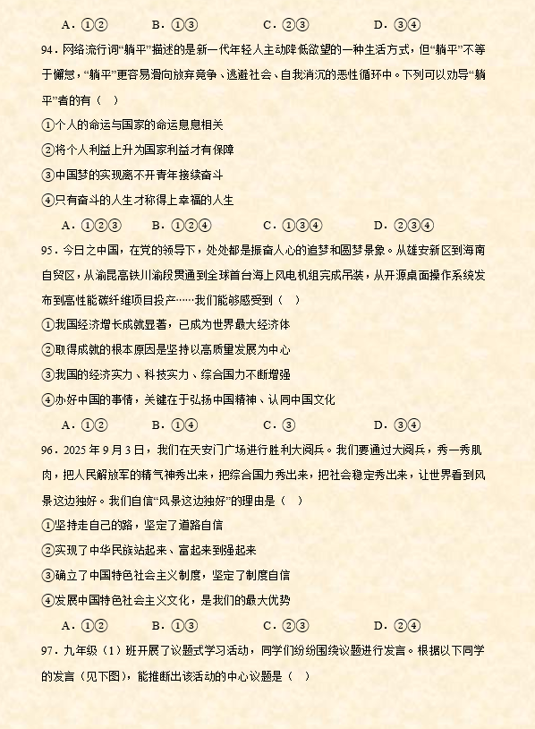 20.当今世界正面临百年未有之大变局,中国迅速崛起,综合国力大幅提升、社会长期安定、文化繁荣发展、人民生活水平提高,成为推动人类文明发展和世界格局改变的最大变量,中国人也更加包容和自信。做自信的中国人,就要( )