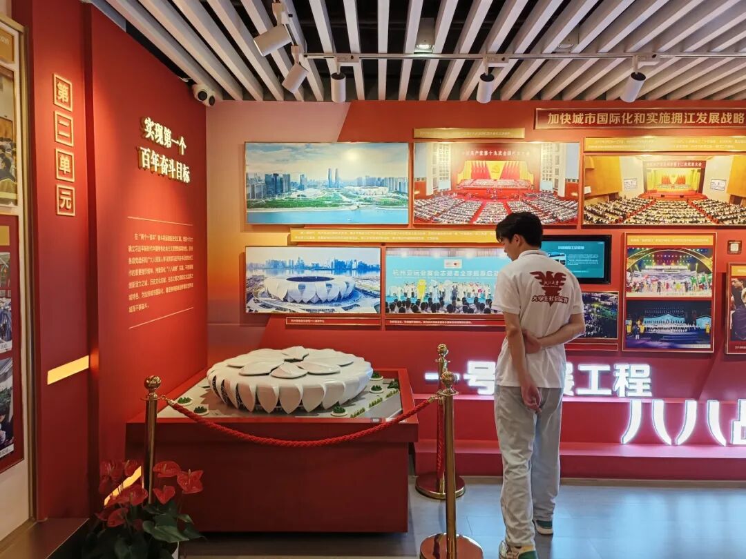 学子们走进中国共产党杭州历史馆,回顾杭州90年重大历史事件。在第一展厅,团队聚焦新民主主义革命征程,驻足“西湖会议”展柜,观李大钊邀请函,感受1921-1949年革命岁月的艰辛与英烈奉献。在第二展厅,学子们惊叹于11块弧形屏组成的“钱江潮涌”,呼应亚运精神,并体验AI绘画屏、触摸“小莲花”模型,感受新时代杭州的匠心与活力。