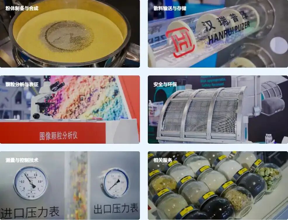 本次展会展品涵盖从粉体制备、输送、检测到安全环保的全产业链,具体如下: