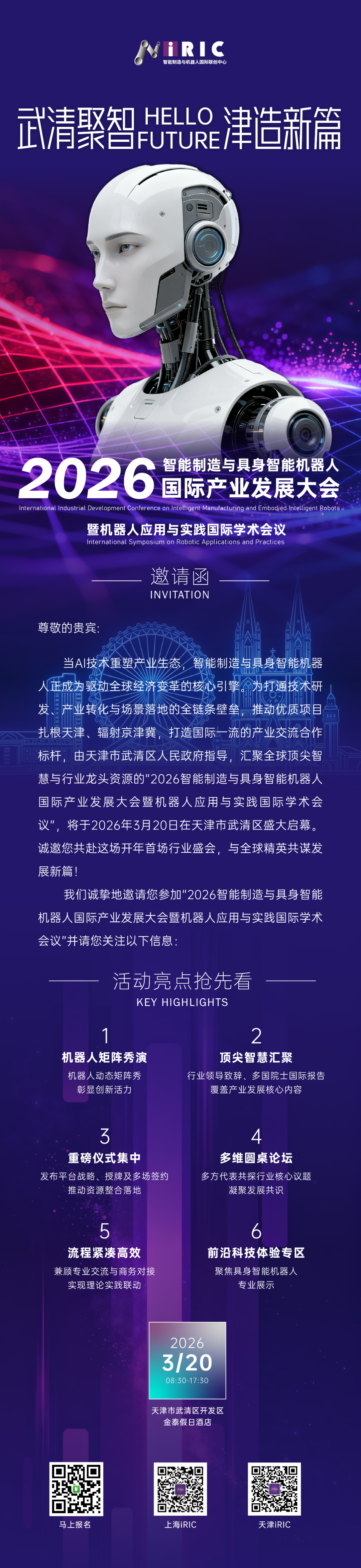 为加快推动智能制造与机器人产业高质量发展,进一步推动优质项目落地、提升区域经济活力和品牌效应,打造智能制造与机器人领域峰会品牌形象,由iRIC智能制造与机器人国际联创中心推出的2026年开年首场“智能制造与具身智能机器人国际产业发展大会暨机器人应用与实践国际学术会议”拟于2026年3月20日在天津武清开发区召开。
