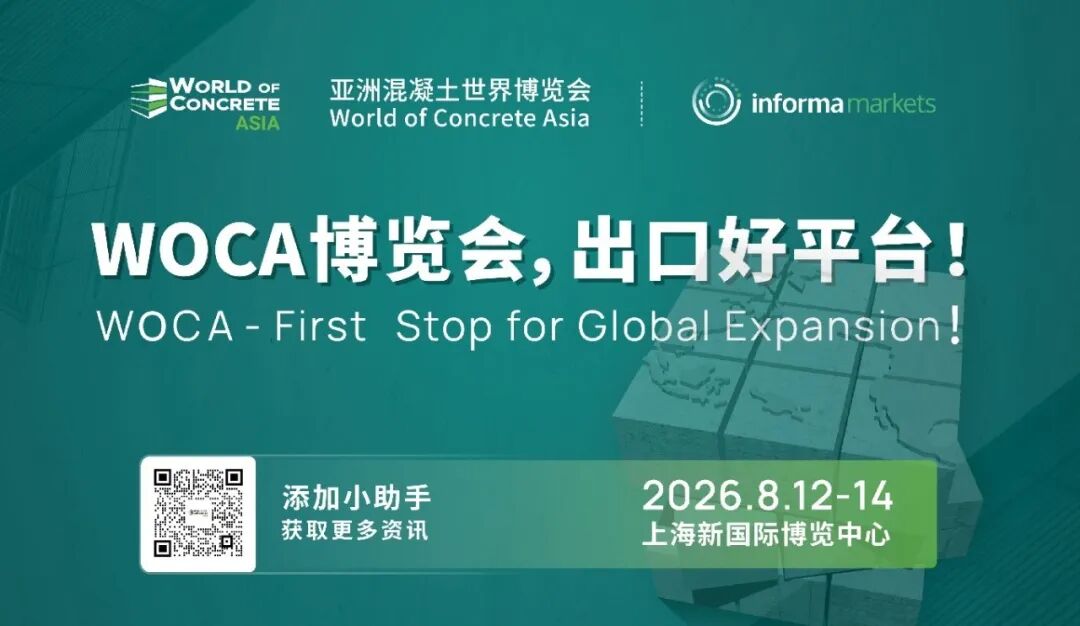 以“WOCA博览会,出口好平台!”为核心主题,2026 World of Concrete Aisa 亚洲混凝土世界博览会将于2026年8月12-14日在上海新国际博览中心举行。