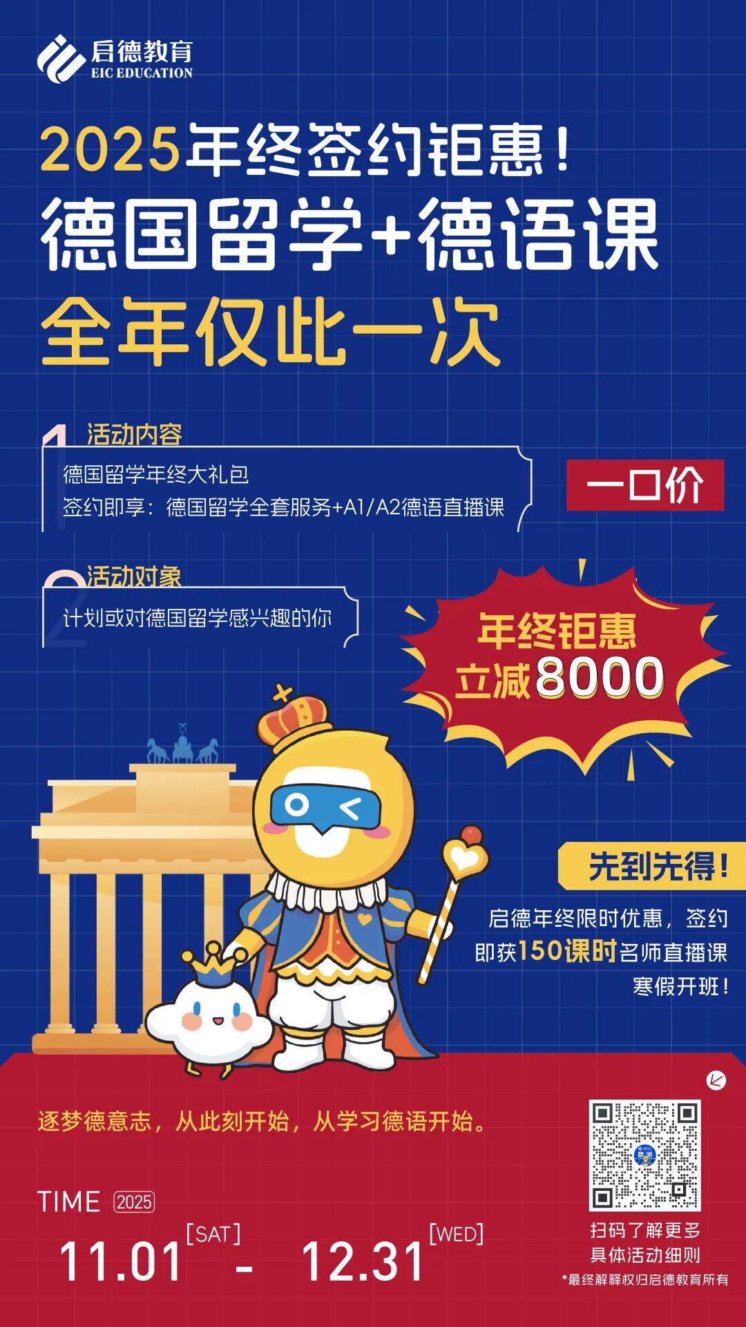为了让更多学生实现德国留学梦想,启德教育特别推出2025年终签约钜惠活动,为你提供全方位的留学保障!