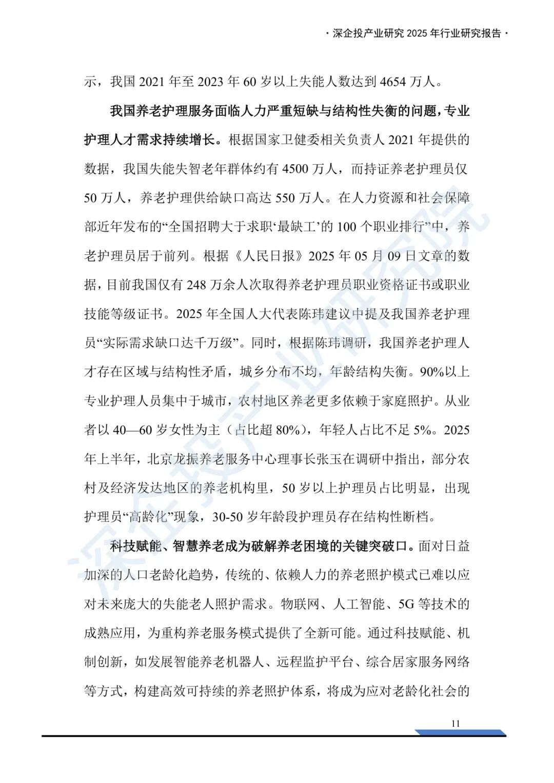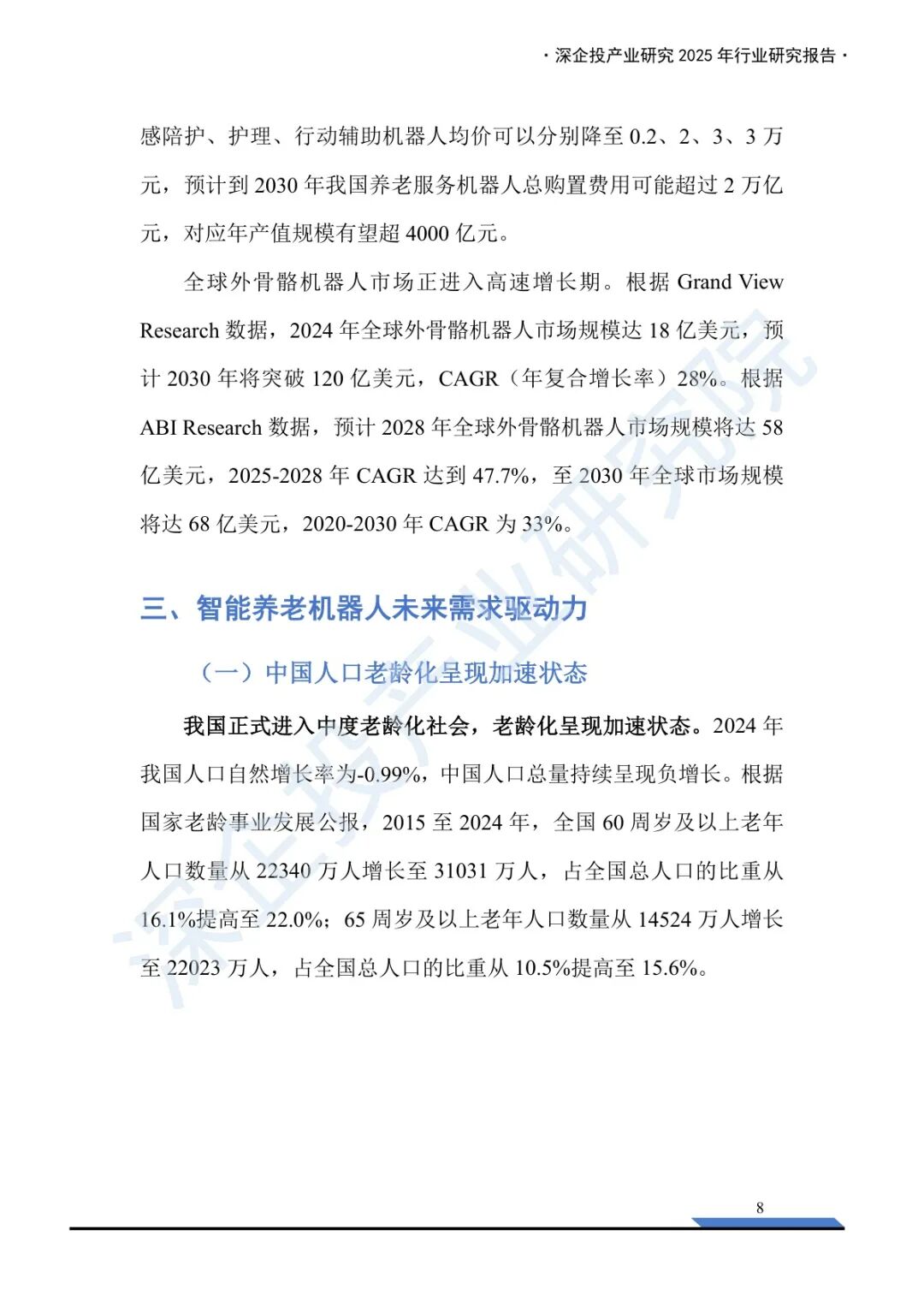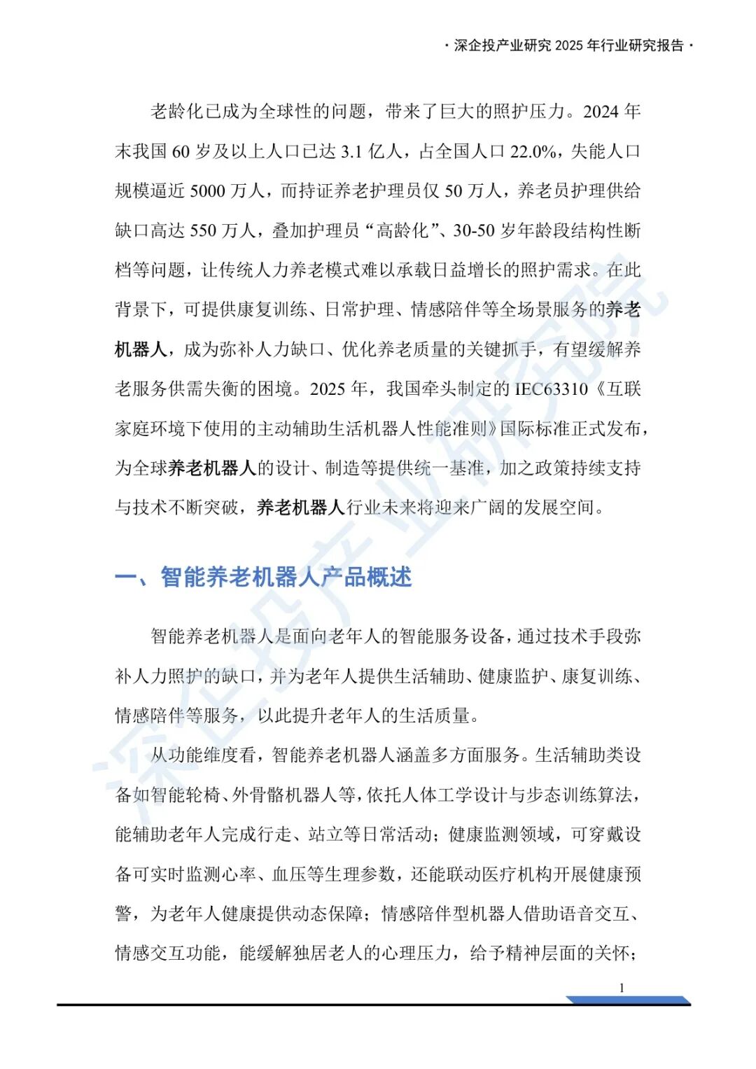 当60岁以上人口突破3.1亿、失能老人逼近5000万,而持证护理员仅有50万时,中国养老体系的脆弱性已不再是未来隐患,而是当下迫在眉睫的危机。在这一背景下,智能养老机器人被推至舞台中央,成为破解“谁来看护我们老去”这一社会难题的关键答案。深企投产业研究院发布的《2025养老机器人行业研究报告》,不仅系统梳理了这一新兴产业的现状与前景,更揭示了技术、政策与需求交织下的复杂图景。