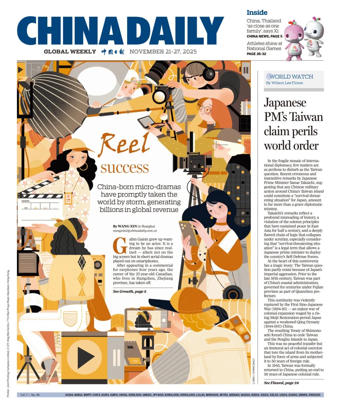 11月21日出版的国际版周报,封面报道聚焦快速发展的中国微短剧产业。凭借短小精悍、情感共鸣强等特点,中国微短剧已经风靡全球,吸引海外演员加入,并推动内容和产业链出海。同时,微短剧在国内市场也不断发生变革,不仅通过人工智能加速创新,更有望与文化旅游、电子商务、公益等多领域融合,带动其他产业发展。