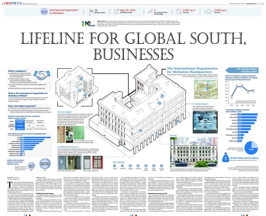 《大湾区焦点》周刊P2-3跨版版面:国际调解院(IOMed)在香港成立,标志着全球冲突解决模式的重大转变。国际调解院以尊重国家主权、平等和不干涉内政为核心原则,降低中小企业维权门槛,助力香港建设国际调解枢纽,强化多极化公平秩序。