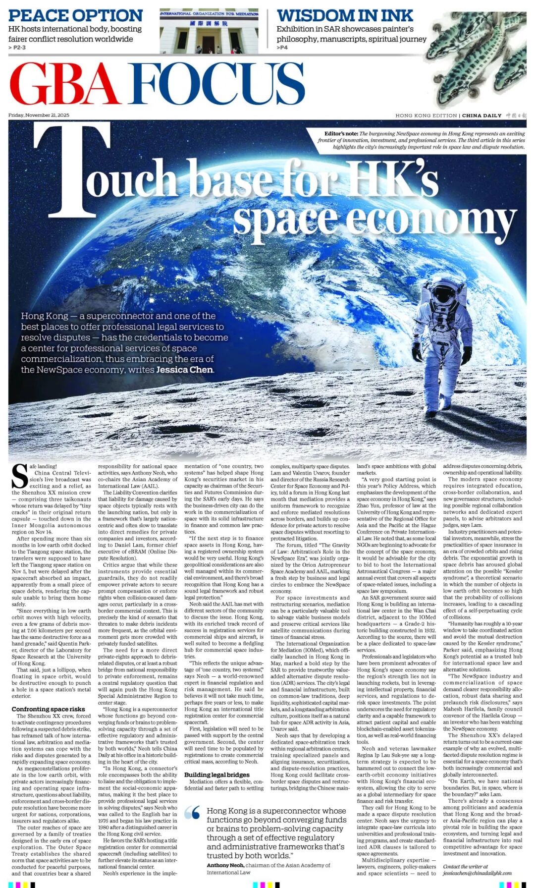 《大湾区焦点》周刊P1版面:神舟二十号疑遭太空垃圾击中,成为太空垃圾危害的切肤之痛,引发业界对商业太空可持续发展展开多方探讨。近期,各国太空经济与法律领域的专业人士纷纷到访香港,使香港再次成为国际焦点。作为备受各方尊重与信赖的普通法司法辖区,香港正逐渐成为国际太空争端仲裁与调解的新高地。