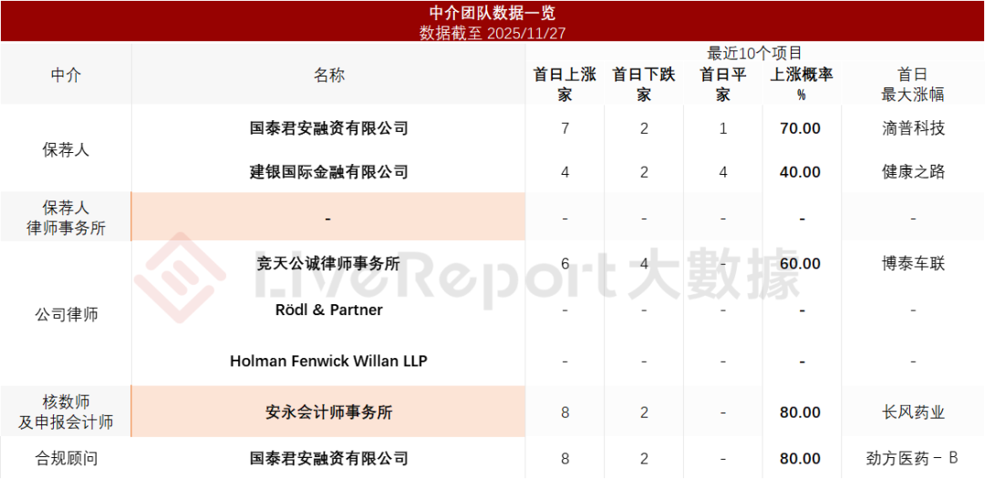 据LiveReport大数据统计,拓璞数控中介团队共计7家,其中保荐人2家,近10家保荐项目数据表现有待提升;公司律师共计3家,综合项目数据表现普通。整体而言中介团队历史数据表现中规中矩。