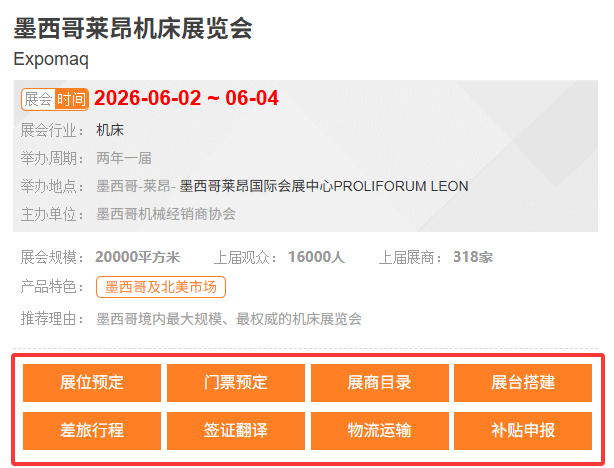 墨西哥莱昂机床展览会Expomaq【展位预定、门票预定、展商目录、展台搭建、差旅行程、签证、翻译、物流运输、补贴申报】