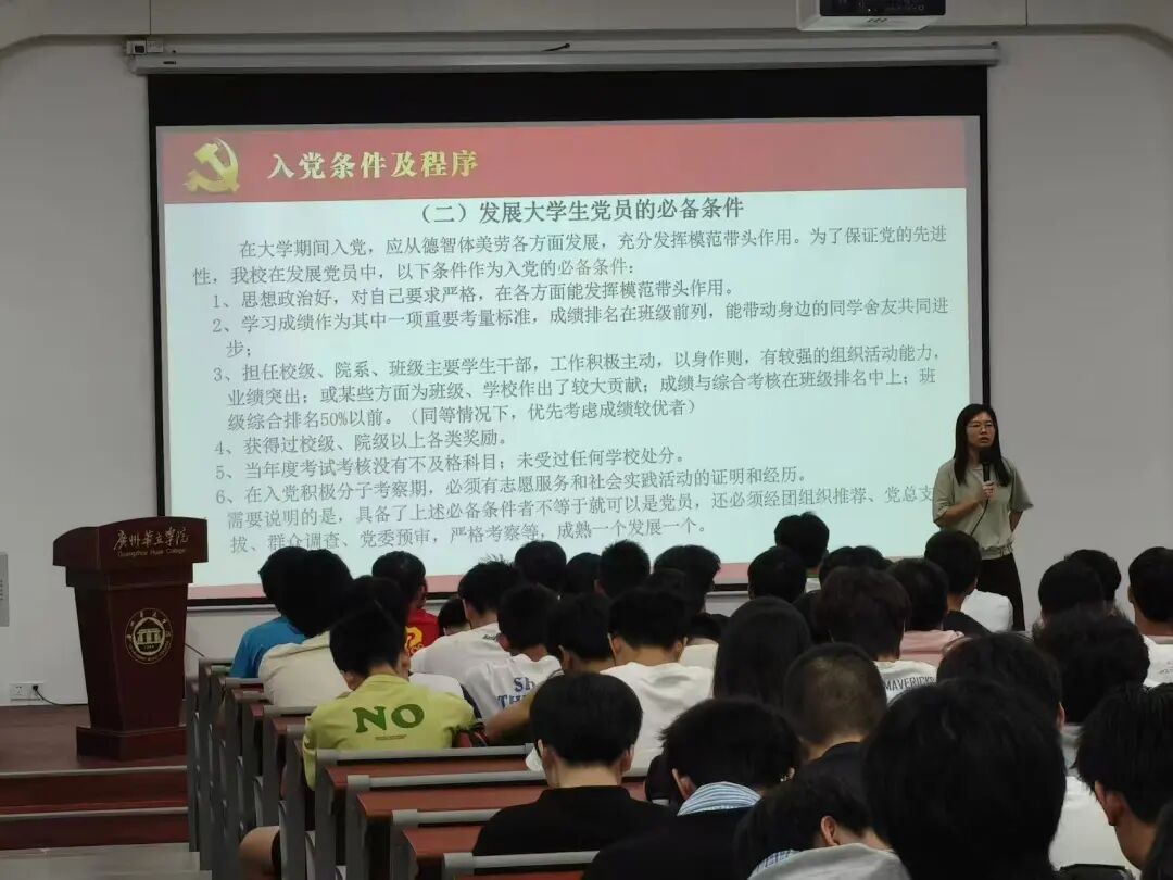 最后,肖汇副书记为新生介绍入党流程时指出,其流程的严谨规范性。从个人递交申请、成为入党积极分子,到发展对象,预备党员及最终转正,每一步都包含组织的培养、考察与评议。同时,入党申请人必须深刻理解并自觉履行党员的各项义务,以《中国共产党章程》为根本遵循,学习、遵守并维护党章。这是一次严肃而系统的政治锻造。入党申请人须承认党的纲领和章程,符合年龄与身份等基本条件。作为大学生,更应品学兼优、信念坚定,以实际行动展现先进性。